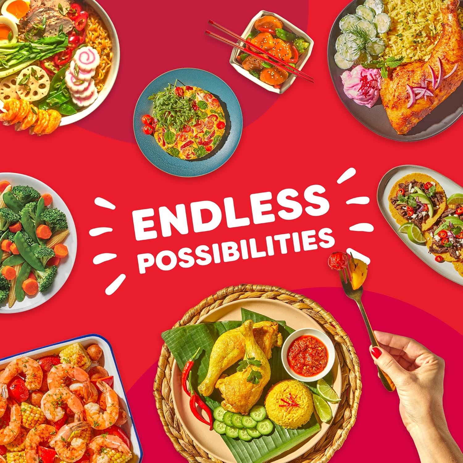 Colorful dishes surround the text “One Pot Endless Possibilities”