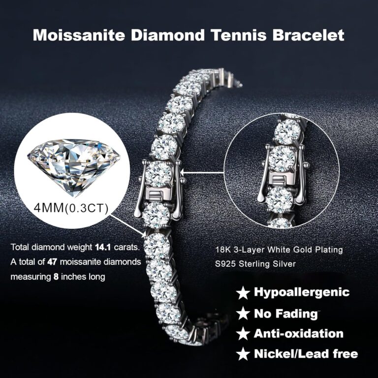 Moissanite Tennis Bracelet.10.5-14 Carats Lab Grown Diamond Tennis Bracelet for Women 18k White Gold Plated 925 Sterling Silver Men’s Bracelet 3-4mm D Color VVS1 Round Cut Moissanite Bracelet for Women Men Jewelry Gift